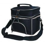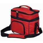 Insulated cooler. Two zippered compartments. Adjustable shoulder strap. Double zippered puller. Zippered pocket on front.
