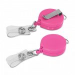 Retractable ID holder with a reliable steel spring and a standard dome attachment for holding plastic ID card holders. It has a pocket clip on the reverse and a split ring on the top for attaching it to a lanyard. Lanyards and clear vinyl ID holders are available on request.