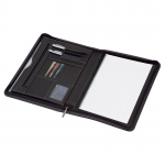 A very stylish and versatile PU compendium with silver stitching Features include zipper closure internal gusseted pocket internal zippered pocket 2 pen loops business card holders and comes with a spiral lined note pad which inserts from the side.