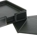 6 quality leatherette drinks coasters housed in matching base, black with white stitching.