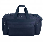 Large 600D polyester with heavy vinyl backing travel bag. zipped front pouch and 2 side pockets, short handles and long shouder adjustable stripe. Comfortable, adjustable carry belt.
